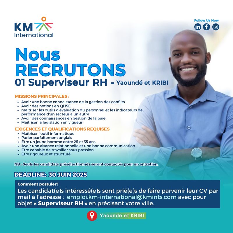 Poste : 01 Superviseur RH – Yaoundé et Kribi