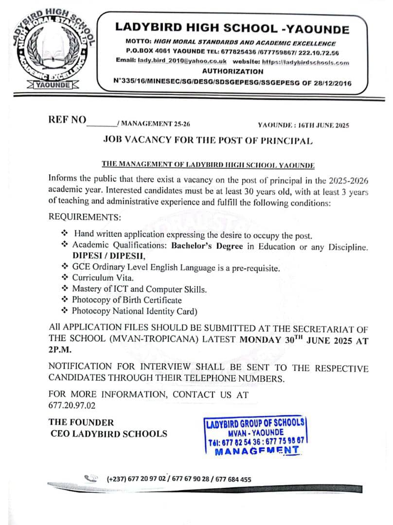 La direction de Ladybird High School à Yaoundé informe le public qu’un poste de proviseur est actuellement vacant pour l’année académique 2025-2026. Les candidats intéressés doivent avoir au moins 30 ans et justifier d’un minimum de 3 ans d’expérience dans l’enseignement et la gestion administrative.