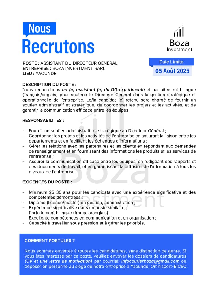 BOZA INVESTMENT SARL recrute un(e) Assistant(e) du Directeur Général expérimenté(e), parfaitement bilingue (français/anglais). Le/la candidat(e) retenu(e) accompagnera le Directeur Général dans la gestion stratégique et opérationnelle de l’entreprise. Ses missions incluent le soutien administratif et stratégique, la coordination des projets, ainsi que la fluidification de la communication interne.