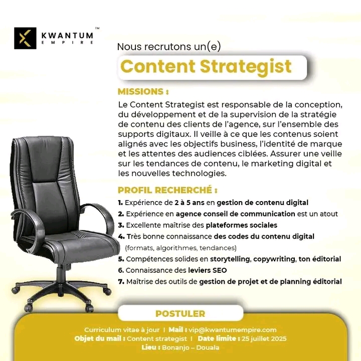 Offre d’Emploi, Content Strategist , Kwantum Empire, Douala