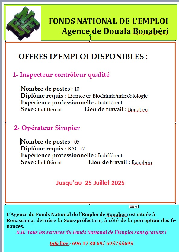• Job, offre d'emploi, FNE, FONDS NATIONAL DE L'EMPLOI , Agence de Douala Bonabéri