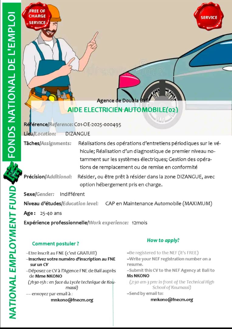 • Le Fonds National de l’Emploi (FNE), à travers son agence de Douala Bali, recherche pour les besoins d’un partenaire deux Aides Électriciens Automobiles.