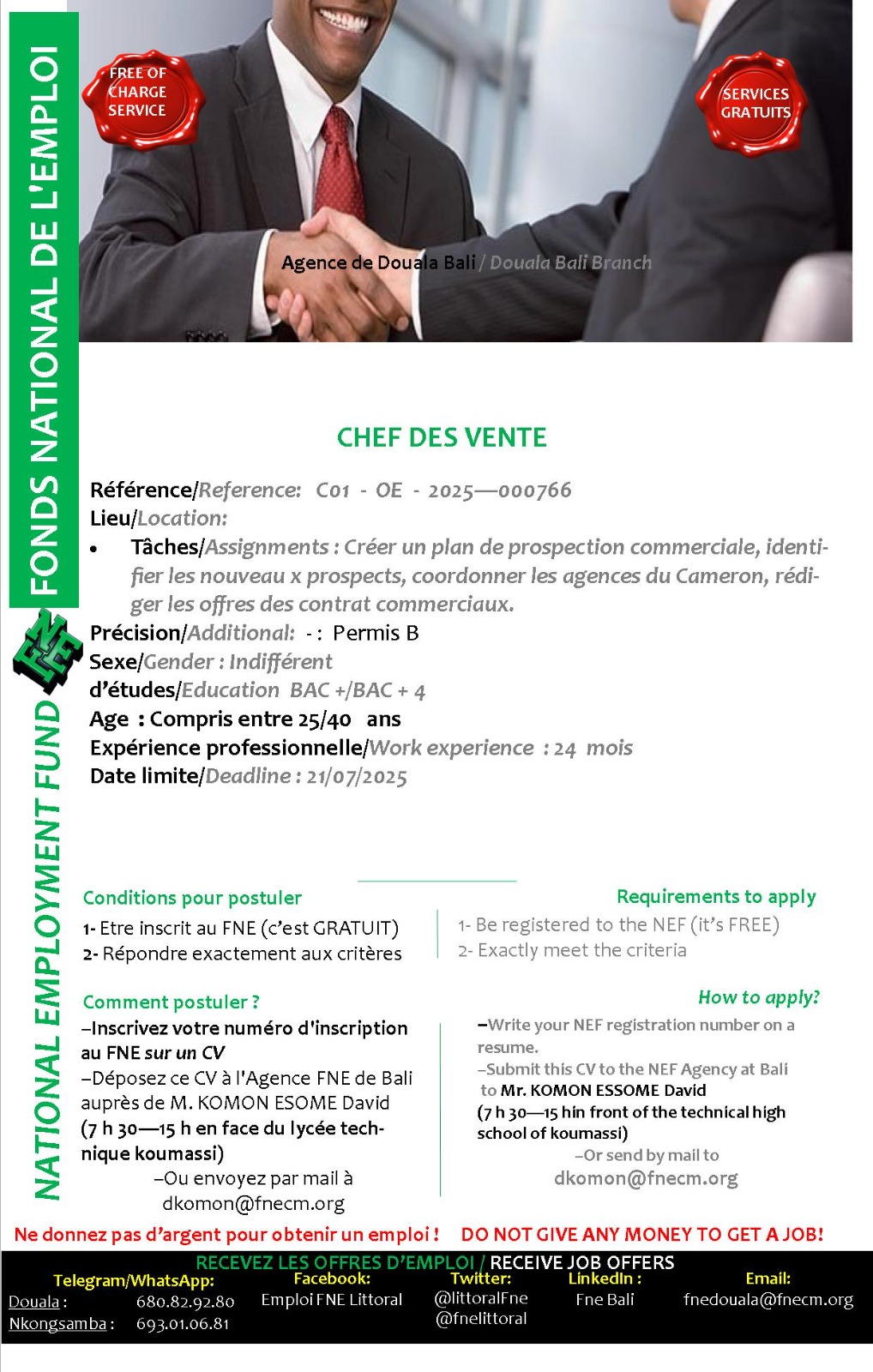 Dans le cadre de ses activités, un partenaire du Fonds National de l’Emploi recherche un Chef des Ventes pour une prise de fonction à court terme.