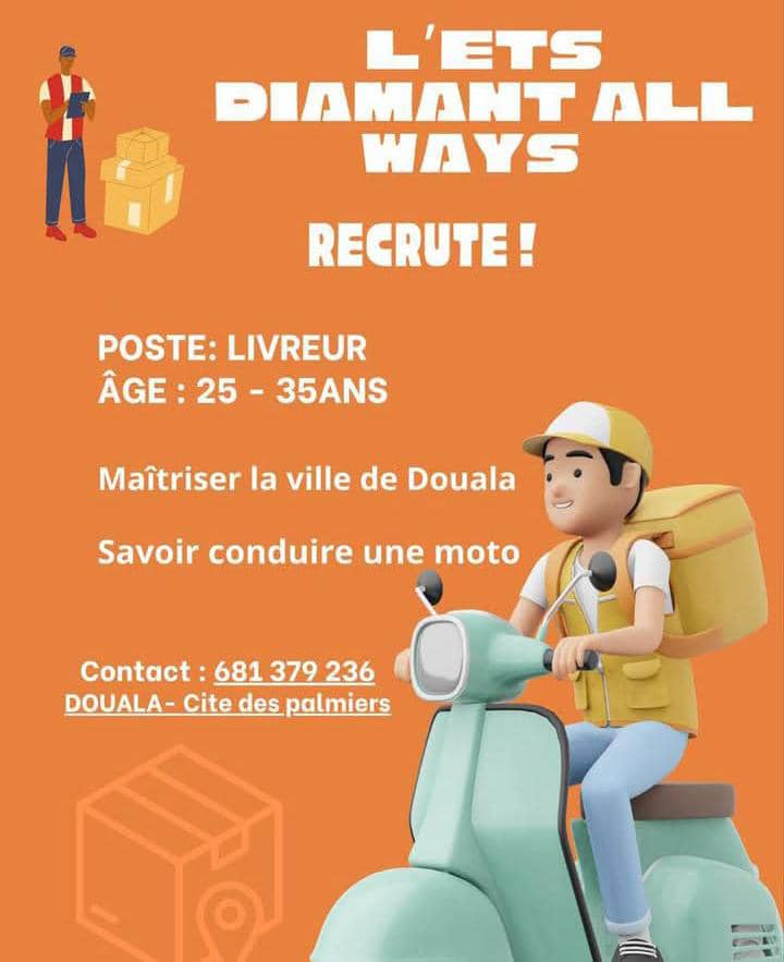 L’entreprise ETS DIAMANT ALL WAYS, située à Douala – Cité des Palmiers, recrute un Livreur pour étoffer son équipe.