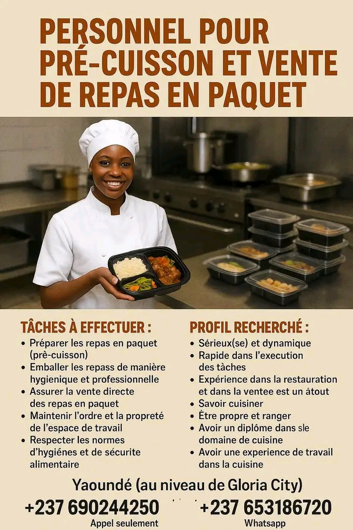 Dans le cadre du lancement de ses activités de restauration, une entreprise basée à Yaoundé (proche de Gloria City) recherche du personnel qualifié pour la pré-cuisson et la vente de repas en paquet.